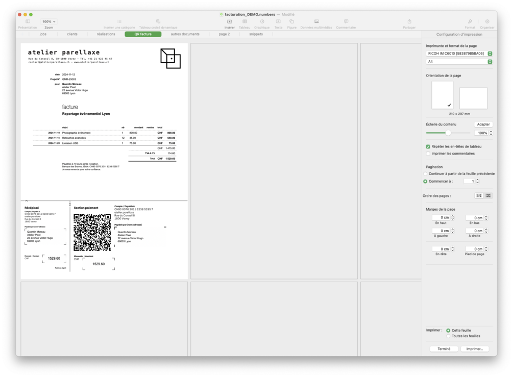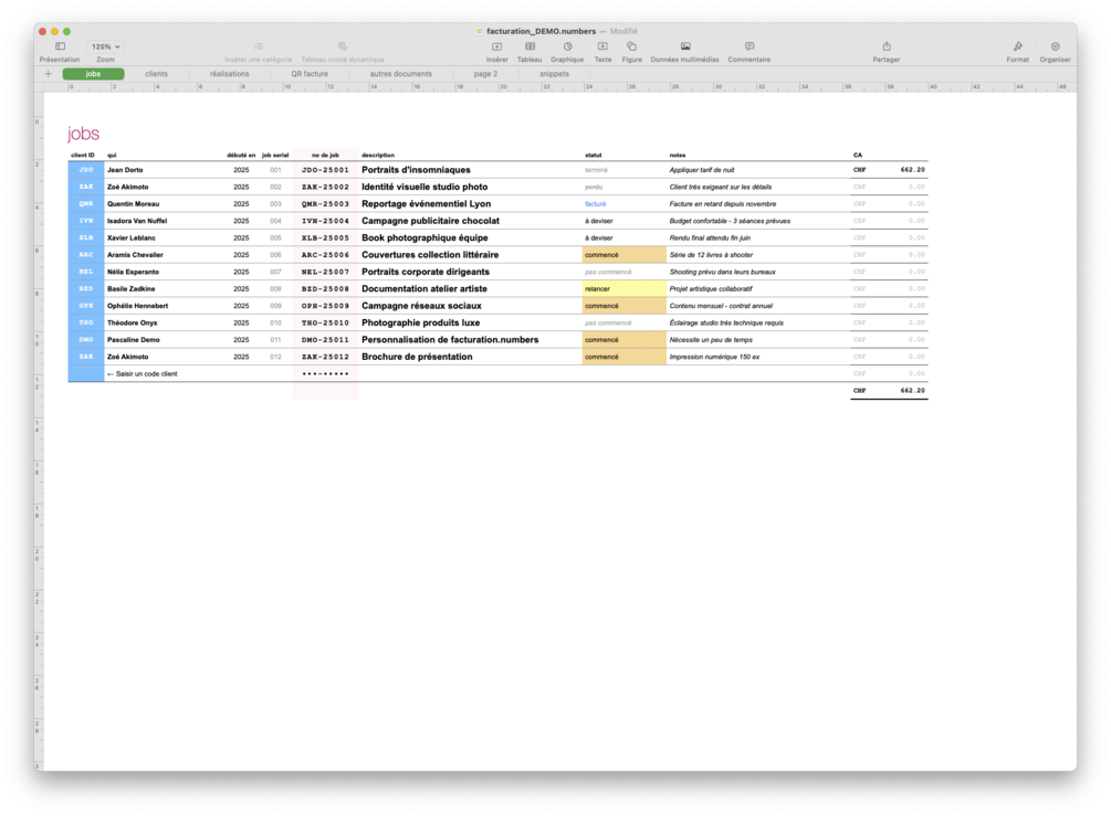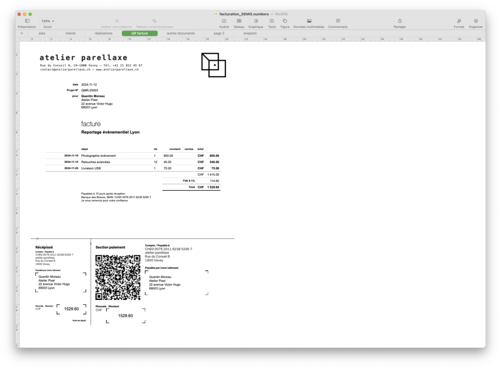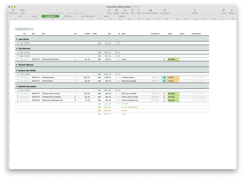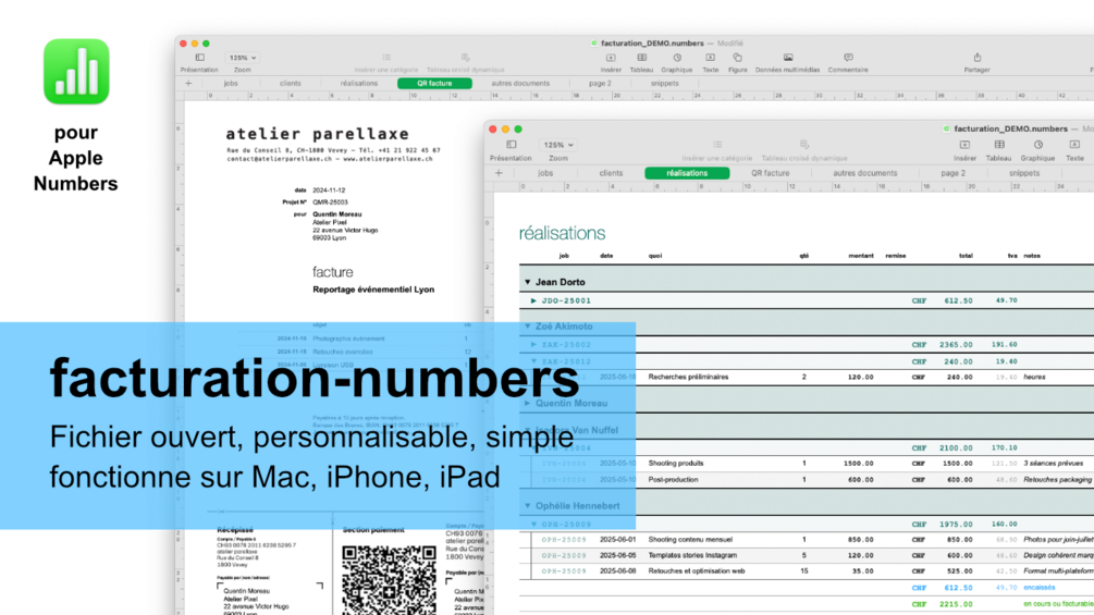 • Projets, clients, prestations, QR-factures suisses, devis + tout ce que vous souhaitez ajouter